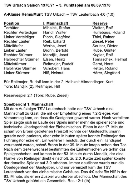 TSV Urbach Saison 1970 1971 TSV Urbach TSV Leutenbach 06.09.1970 Seite 1