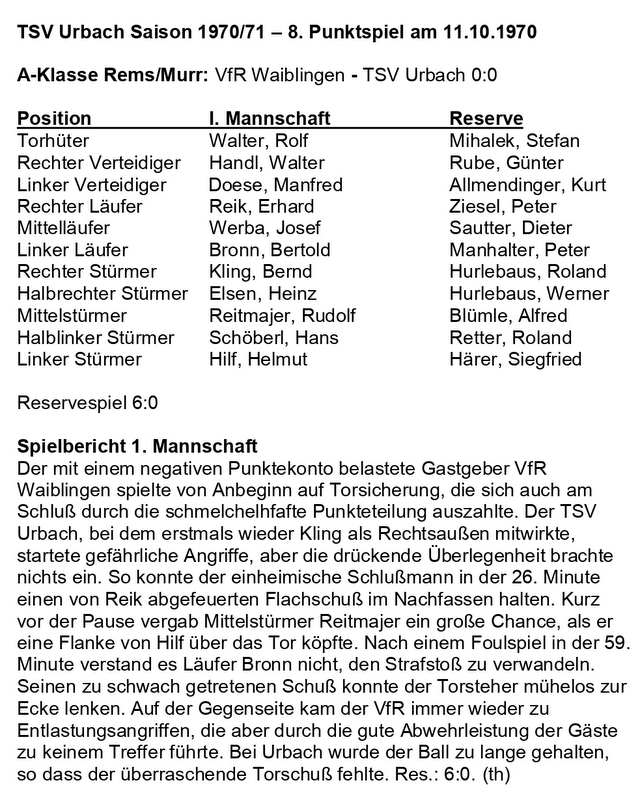 TSV Urbach Saison 1970 1971 VfR Waiblingen TSV Urbach 11.10.1970