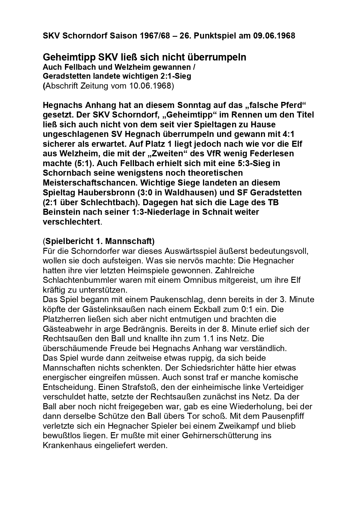 SKV Schorndorf Sasion 1967 1968 SV Hegnach SKV Schorndorf 09.06.1968 Seite 1