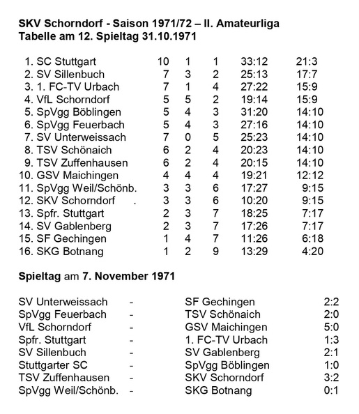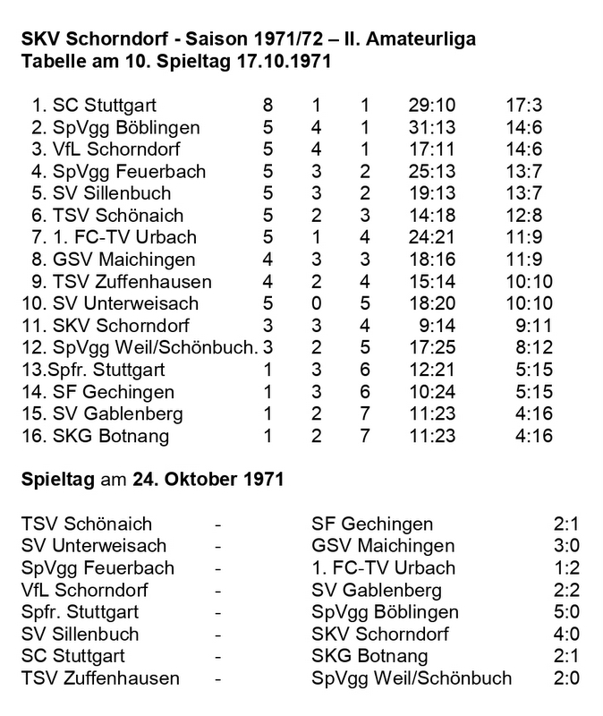 SKV Schorndorf Saison 1971 1972 Tabelle 10. Spieltag 17.10.1971