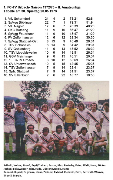 FCTV Urbach Saison 1972 1973 Tabelle 27. Spieltag 29.04.1973 Ergebnisse 21. Spieltag 06.05 1973