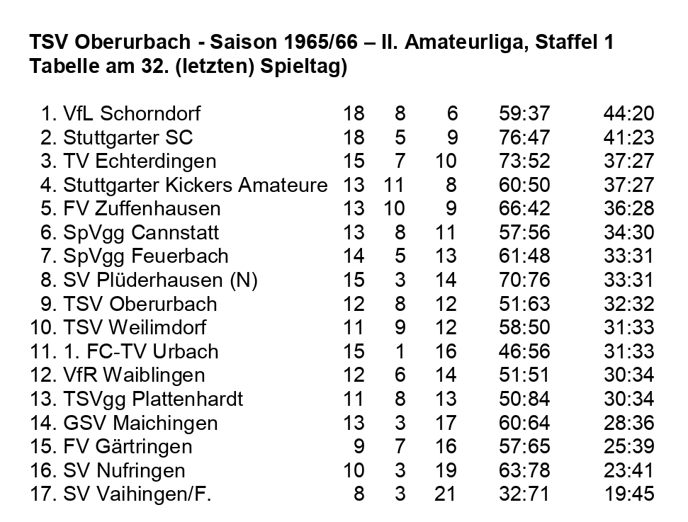 TSV Oberurbach Saison 1965 1966 II. Amateurliga, Staffel 1, Abschluss-Tabelle 32. Spieltag